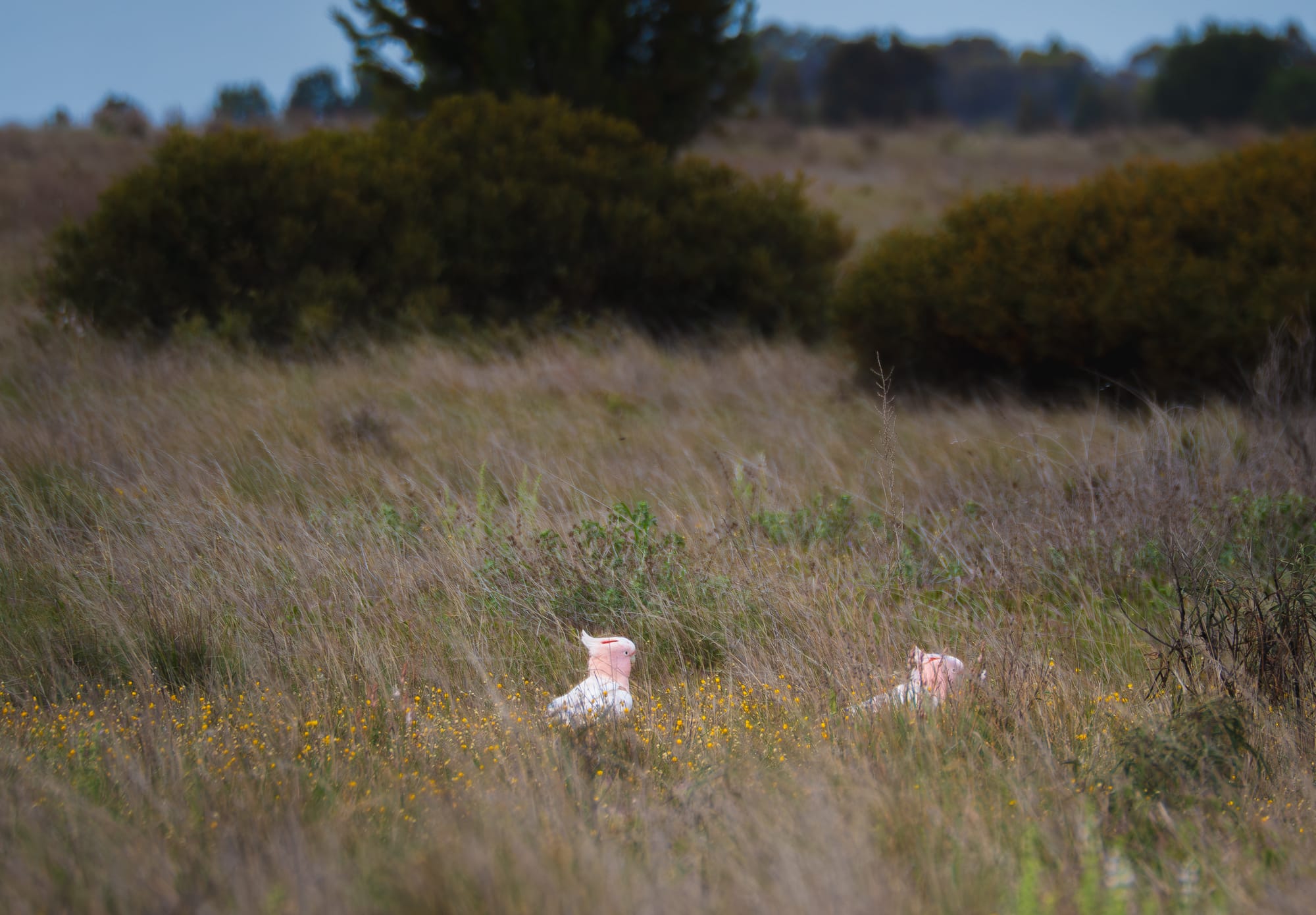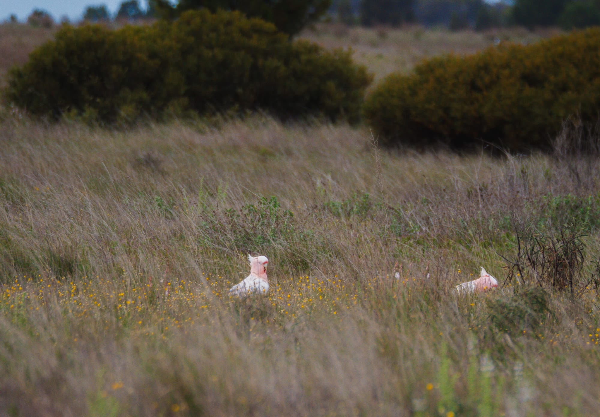 Eventually, I find my quarry. Two pink cockies, sitting in the long grass, a fair distance off, but close to enough to get a passable proof-of-sighting photo. I think Graham really enjoyed my haphazard skid to a stop and leap out of the car.