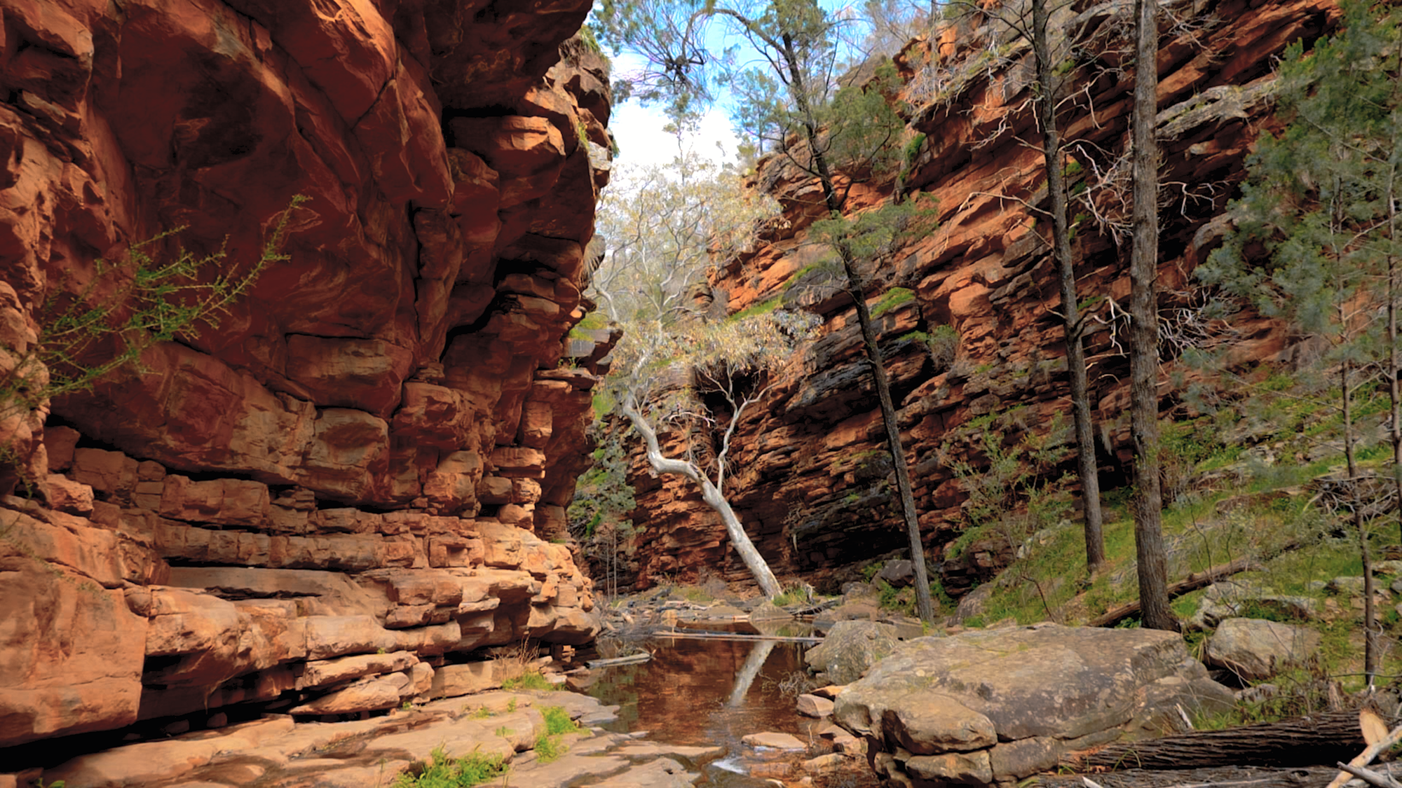 The walk through the gorge turned out to be absolutely stunning. A tight, rocky gorge with a creek flowing through it. Red stone walls shaped into undulating patterns by eons of erosion. Still water mirroring the overhead trees.