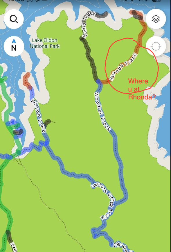 Wombat track - similar to Wilsons, but maybe a bit gnarlier. It continues onto Webb track and apparently Rhonda track, but we couldn't see any track when newtracs says Rhonda track is, just a bit of a clearing.